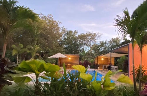 Peaceful and tranquil destination to chill amongst the tropical plants and wildlife yet within driving distance to Tamarindo for restaurants, bars and exciting nightlife. This four bedroom house has AC and large rooms with high ceilings, provides plenty of space for groups or families. Equipped with laundry, large kitchen and open concept living/dining room.