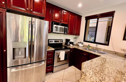 This Condo is located in the Center of Jaco beach. Walk to everywhere. It comes with 2 bedrooms, 2 baths, a fully equipped kitchen, AC in each room, hot water, strong WIFI, pool, parking lot and security. There is also a Concerge desk available. We also provide free maid service every 2 days and once a week on monthly stays for free.